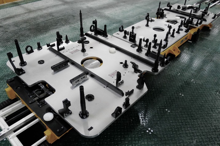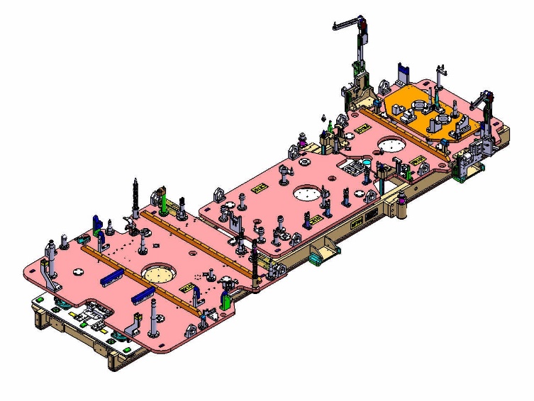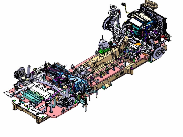 合裝托盤是在底盤裝配線至合裝線的環(huán)線中用于承載包括發(fā)動(dòng)機(jī)在內(nèi)的底盤各個(gè)裝配件的載具。合裝托盤由主框架和三個(gè)分裝托盤,即前托盤(含發(fā)動(dòng)機(jī)托盤)、中托盤和后托盤組成。合裝托盤與底盤裝配工藝、輸送設(shè)備和合裝裝配工藝都有著緊密的關(guān)聯(lián),因此它的設(shè)計(jì)難度和要求都很高。作為一個(gè)造價(jià)高昂的載具,設(shè)計(jì)理念優(yōu)秀且制作精良的合裝托盤能夠最大程度的保證合裝的可靠性,并具有一定的裝配工藝延續(xù)性和可拓展性。