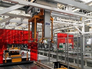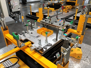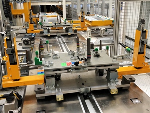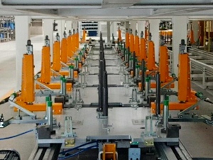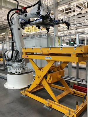 該工廠的生產(chǎn)節(jié)拍為40JPH,主要用以生產(chǎn)S300/S500/S700車型。分托盤采用多車型兼容性設(shè)計,配置有切換機(jī)構(gòu)和插拔銷結(jié)構(gòu),設(shè)計形式較為復(fù)雜??胀斜P轉(zhuǎn)載首次采用了機(jī)器人+氣動抓手+視覺識別系統(tǒng)的設(shè)計應(yīng)用,穩(wěn)定可靠。