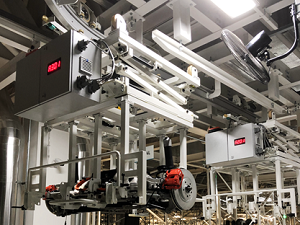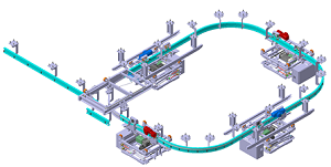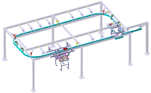 The EMS is an overhead conveying system with individually driven trolleys moving independently on the track rail system. Each trolley has its own control box. The trolleys are normally supplied with electrical power and control signals through bus bar system attached on the track rails or with the latest technology “Movi-trans” through contactless induction. The EMS conveyor system has been widely applied in different field of logistics because of its flexibility, high efficiency, clean, low noise and precise positioning.